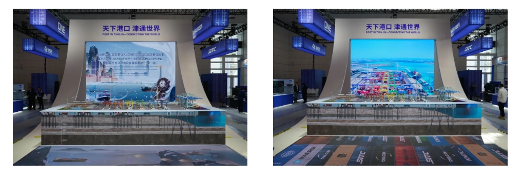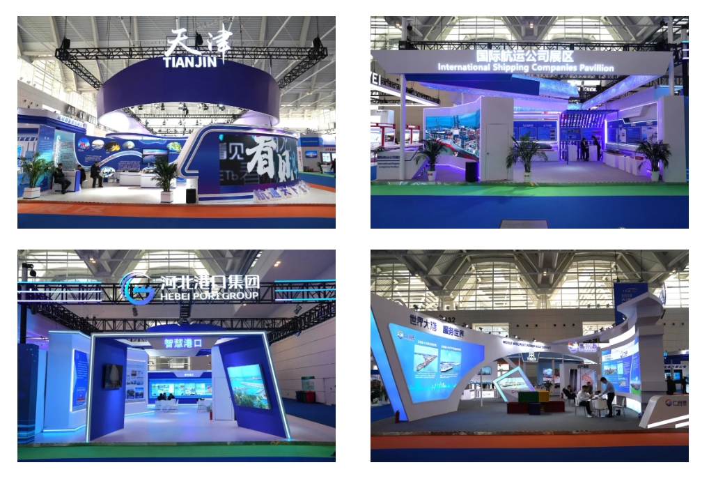 天津港集团作为本次大会的主办单位之一,携近年来港口建设最新成果,惊艳亮相N17展馆港口机械设备展区。588平方米区域展位,其设计灵感来自于一幅徐徐展开的画卷,其中的元素既包含以“印象津港”版画为代表,港产城融合一体谋划的企业发展理念,也包含以集装箱和港口机械元素为代表,天津港集团“志在万里、勇攀高峰”的企业精神和“天下港口、津通世界”的企业形象。全面展现天津港集团向海而兴、勇立潮头,加快世界一流绿色智慧枢纽港口建设、开启蓬勃兴盛新征程的奋进之路。