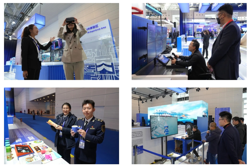 除此之外,这里有时下流行的VR体验项目,戴上小巧精致的VR眼镜,观众们就可以实时看到港口生产作业一线的场景;这里有数字人体验项目,天津港IP卡通形象“天天”化身数字人,详细介绍天津港小知识,为观众答疑解惑;这里还有岸、场桥远控操纵模拟台,观众坐上操作台,晃动摇杆,便可现场“试驾”,体验“抓箱子”的快乐……