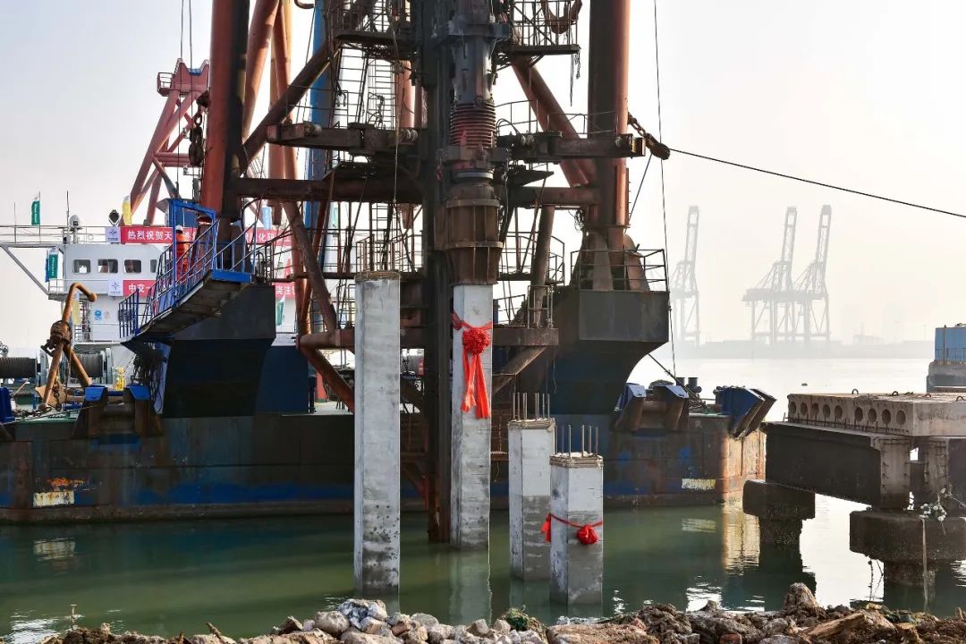 让时间的指针拨回到2019年1月17日,习近平总书记亲临天津港视察,作出了“要志在万里,努力打造世界一流的智慧港口、绿色港口”的重要指示。作为天津港集团忠诚践行领袖嘱托的重大项目,天津港北疆港区c段智能化集装箱码头项目在万众期待中酝酿而生。2019年7月,项目建设方案初步确定,为了尽快开工,天津港建设者们在政府各主管单位的大力支持下,创新多线并行推进模式,仅用5个月时间,就办理完成了开工前的全部许可手续,创造了国内同类码头前期工作周期最短的纪录。承载着高度期许,2019年12月28日,在天津港北疆港区的滩涂上,顺利打下第码头一根桩,揭开了一项与时间赛跑、与科技比高的攀登序幕。