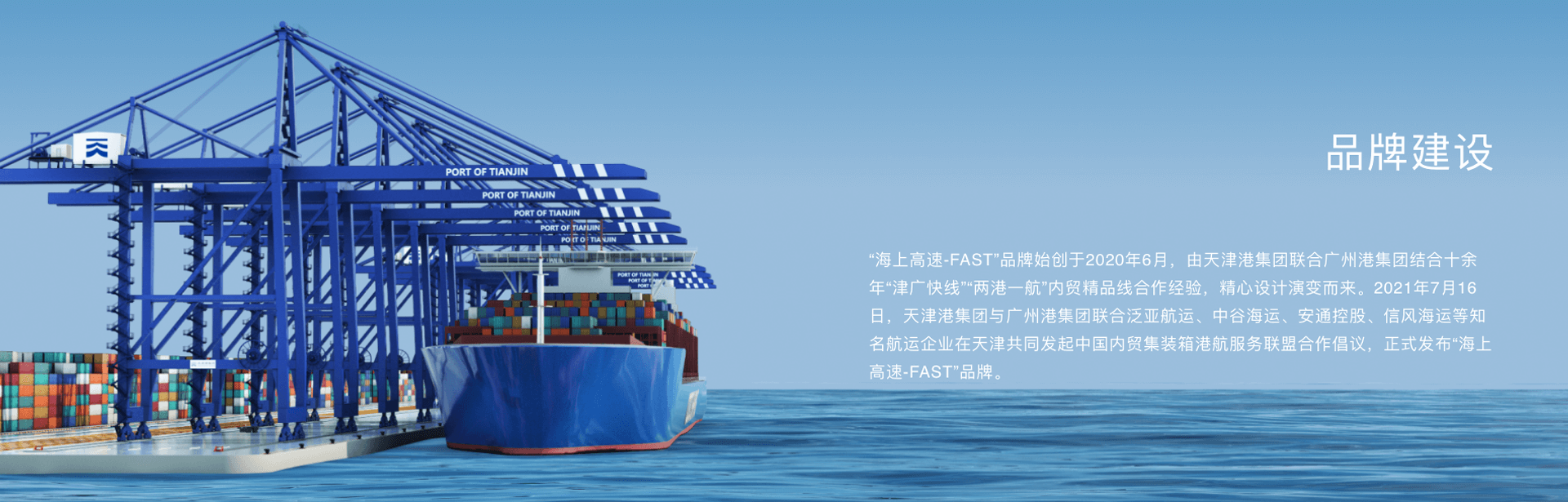 2021年7月天津港集团与广州港集团联合泛亚航运、中谷海运、安通控股、信风海运等知名航运企业发起中国内贸集装箱港航服务联盟,共同发布“海上高速-FAST”品牌。通过创新港航服务“生态圈”,打造“两港一航”精品航线升级版,持续增强南北港口协同联动,深度挖潜南北海运大通道,加快构建京津冀-粤港澳大湾区交通主轴,更好服务国内大循环、国内国际双循环的新发展格局。