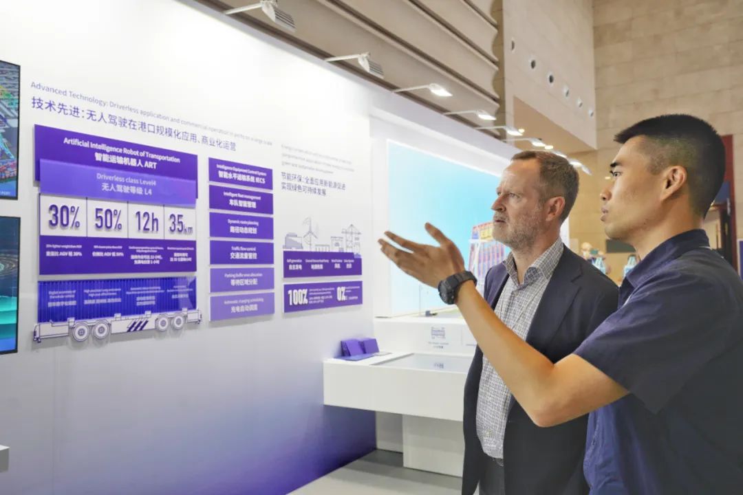 在天津科技展示区,天津港全球首个“智慧零碳”码头的全景式互动沙盘吸引了来自世界各地嘉宾驻足关注。这个码头岸线总长1100米,占地面积75万平方米,拥有3个20万吨级的泊位,拥有12台单小车岸桥、42台轨道桥、92台智能水平运输机器人(ART)。这些元素全部“浓缩”在一起:沙盘上“岸桥”在船边移动,“场桥”在堆场往来,风电设备稳定运行……这座“建设周期最短、智慧程度最优、运营成本最低、装卸效率最高、绿色低碳最佳、适用范围最广、颜值色彩最美”的“智慧零碳”码头,向世界展示着天津港世界一流绿色智慧枢纽港口建设的生动成果。