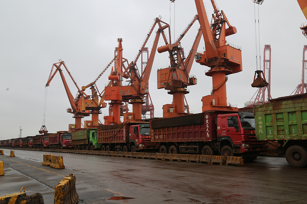 一列列等待卸货的运输车排满装卸通道