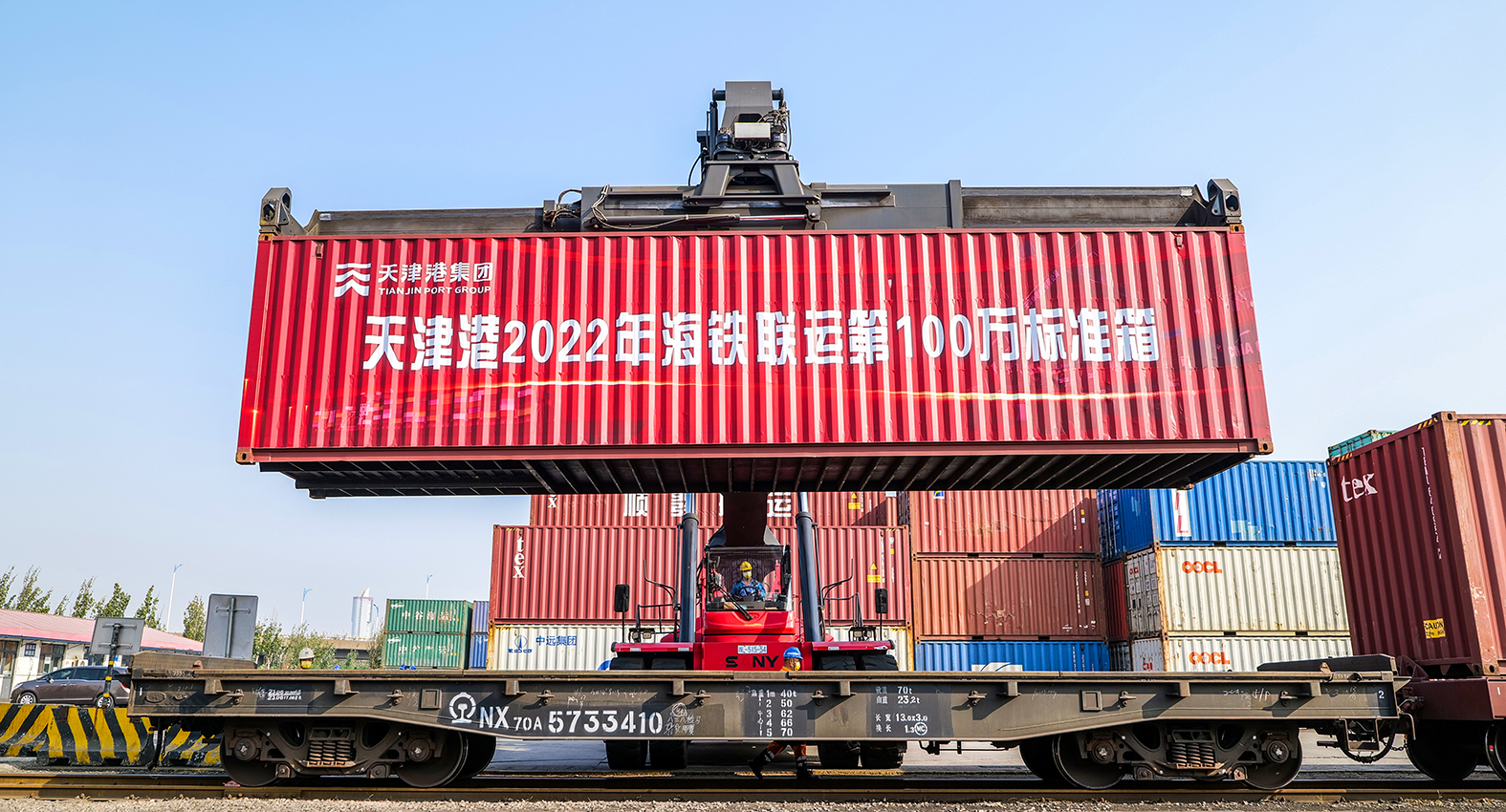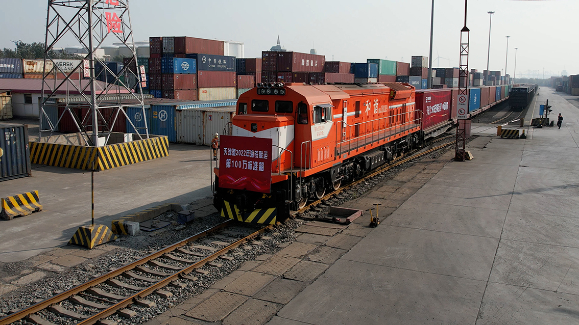 10月25日上午,天津港物流发展公司物捷三堆场里车辆往来穿梭,来自多个国家的集装箱正一个个吊装上即将发往二连浩特的班列。随着最后一箱吊装上车,经过加固、巡检后,班列缓缓驶出,以此为标志天津港集团2022年海铁联运量顺利完成100万标准箱,比2021年提前了64天,同比增长21.1%,全力保障了国内国际产业链、供应链稳定畅通,以昂扬奋进姿态在新时代新征程上贡献津港力量。