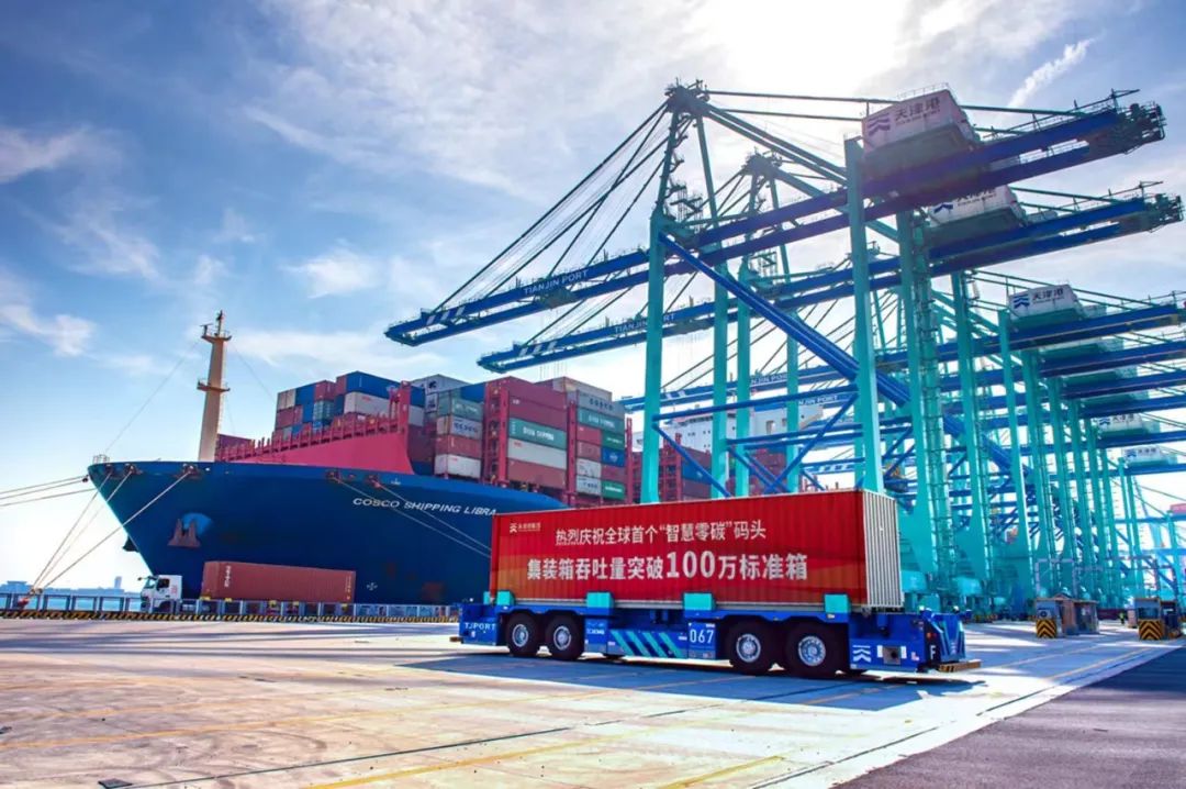 10月13日上午,随着自动化岸桥将投产运营以来的第100万个标准箱,从智能水平运输机器人上稳稳吊起,装上近400米长的“中远海运天秤座”轮,天津港全球首个“智慧零碳”码头仅用时33个月,创下了从开工建设到完成100万标准箱作业的全球自动化集装箱码头用时最短纪录,向党的二十大献礼。