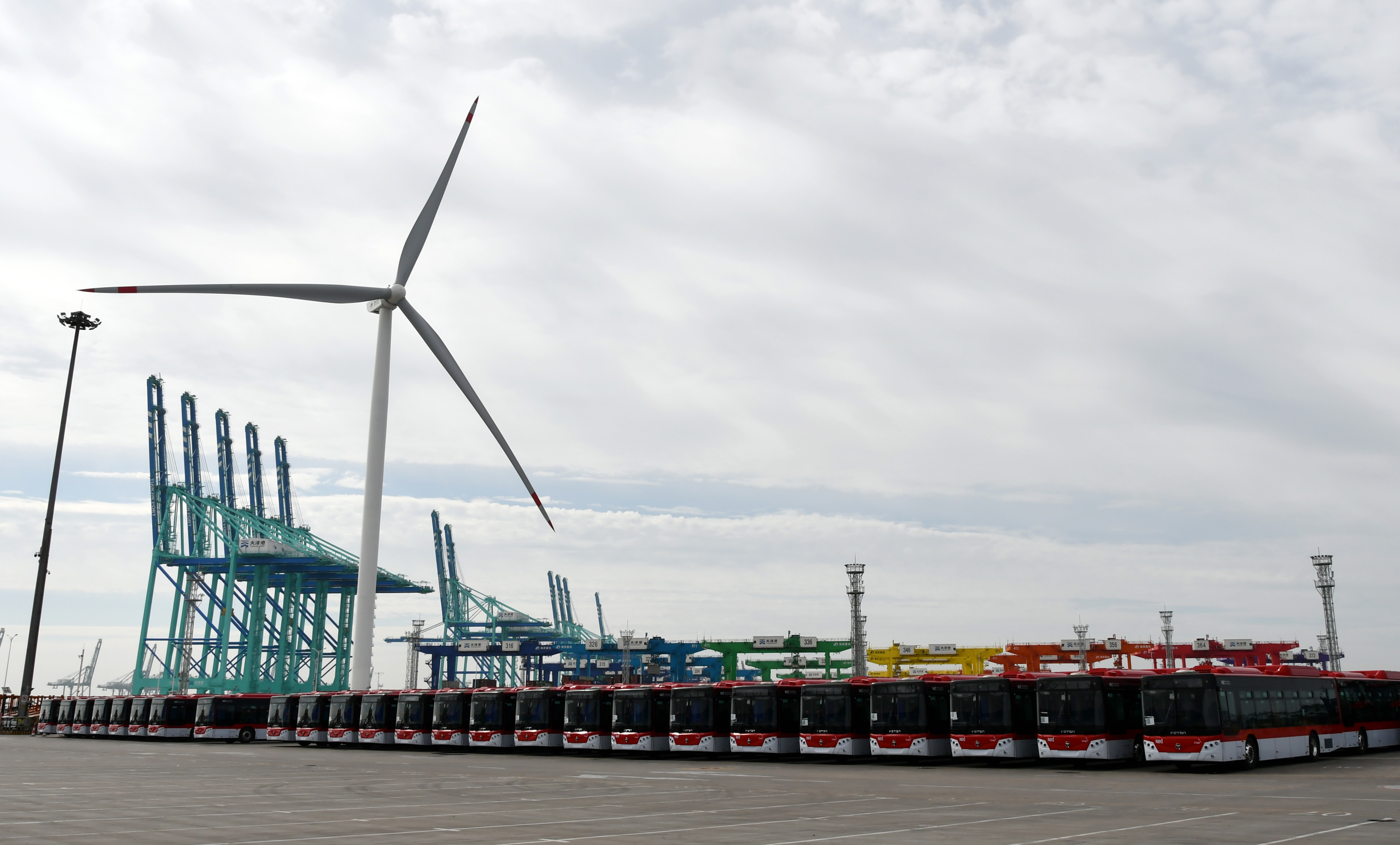 8月15日,100辆福田品牌新能源大巴车在环球滚装码头公司顺利装船,搭乘“海洛斯”轮驶往南美洲智利圣安东尼奥,创天津口岸国产自主品牌新能源大巴车出口历史新高。