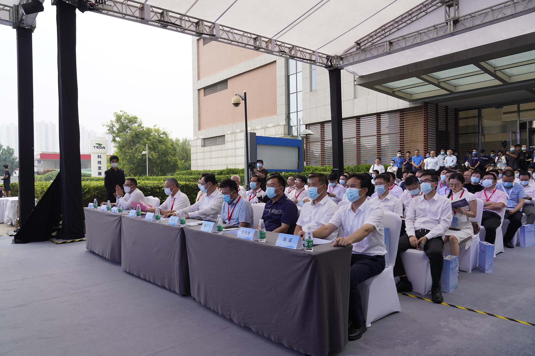 天津市副市长杨兵,中国科学院院士、南开大学副校长陈军,中国工程院院士、武汉理工大学首席教授严新平,市交通运输委党委委员、市港航局党组书记局长王洪海,滨海新区副区长陈波,华为公司董事长梁华,华为全球技术服务部副总裁荀速,华为海关和港口军团CEO 岳坤,天津港集团党委副书记、总裁焦广军等嘉宾出席揭牌仪式。天津港集团副总裁杨杰敏与其他成员单位代表共同开启智慧港口全球创新实验室。