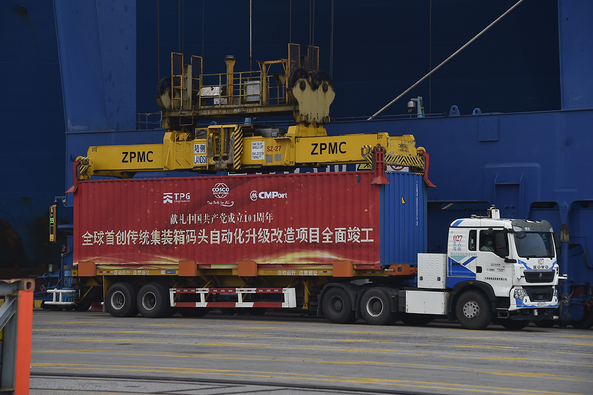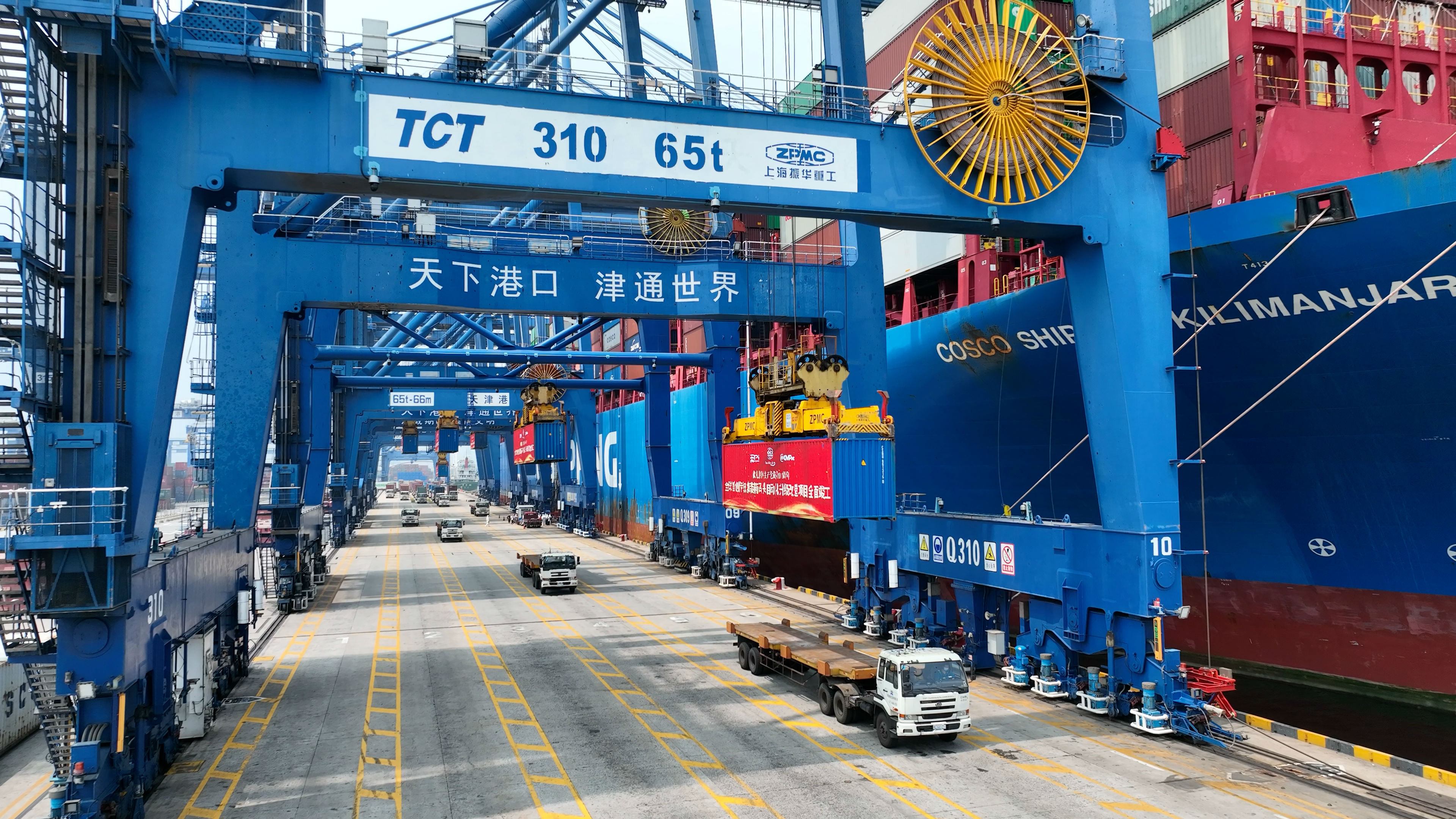 作为中国大陆第一个现代化国际集装箱专业码头公司,天津港集装箱公司紧跟数字信息技术发展趋势,赋能码头生产业务,迭代升级智慧港口建设,与天津联通合作打造5G全连接码头,相继落地5G智能无人集卡、5G岸桥远程控制、5G智能理货、5G智能加解锁站、集装箱作业任务集成管理系统五大场景应用,成为全球首个获批建设的港口自动驾驶示范区、实现全球首个无人集卡场景下陆侧“一键着箱”、建成全球首台集装箱地面智能解锁站、全球首个集装箱设备任务集成管理系统ETMS,实现了全球首创传统集装箱码头自动化升级改造项目全面竣工,树立了传统码头智能化改造新标杆。