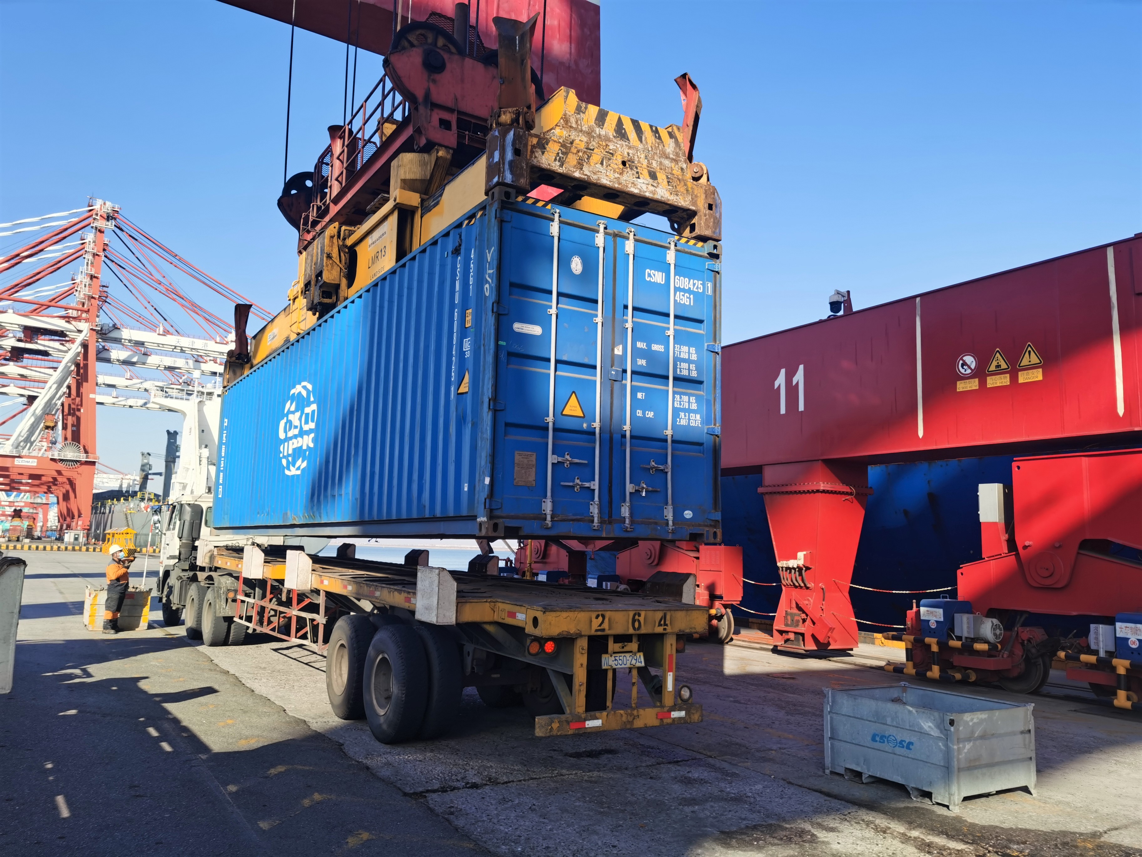 11月21日08:30,靠泊在联盟国际公司北4泊位的“新兰州”轮准时开始卸船作业,在天津海关监管下,装载苜蓿草和瓦楞纸板货物的进口集装箱从船上吊装下船后,从转运堆场装在外集卡上直接驶出码头闸口,在此之前放行电子信息早已传输到码头操作系统中,这是天津港开展“船边直提”作业模式的日常工作场景,不仅实现了船舶抵港、卸船装车及货物提离的“零等待”,更加快了天津港集装箱货物的快速周转,为进出口企业创造更便捷快速的港口集疏运服务。