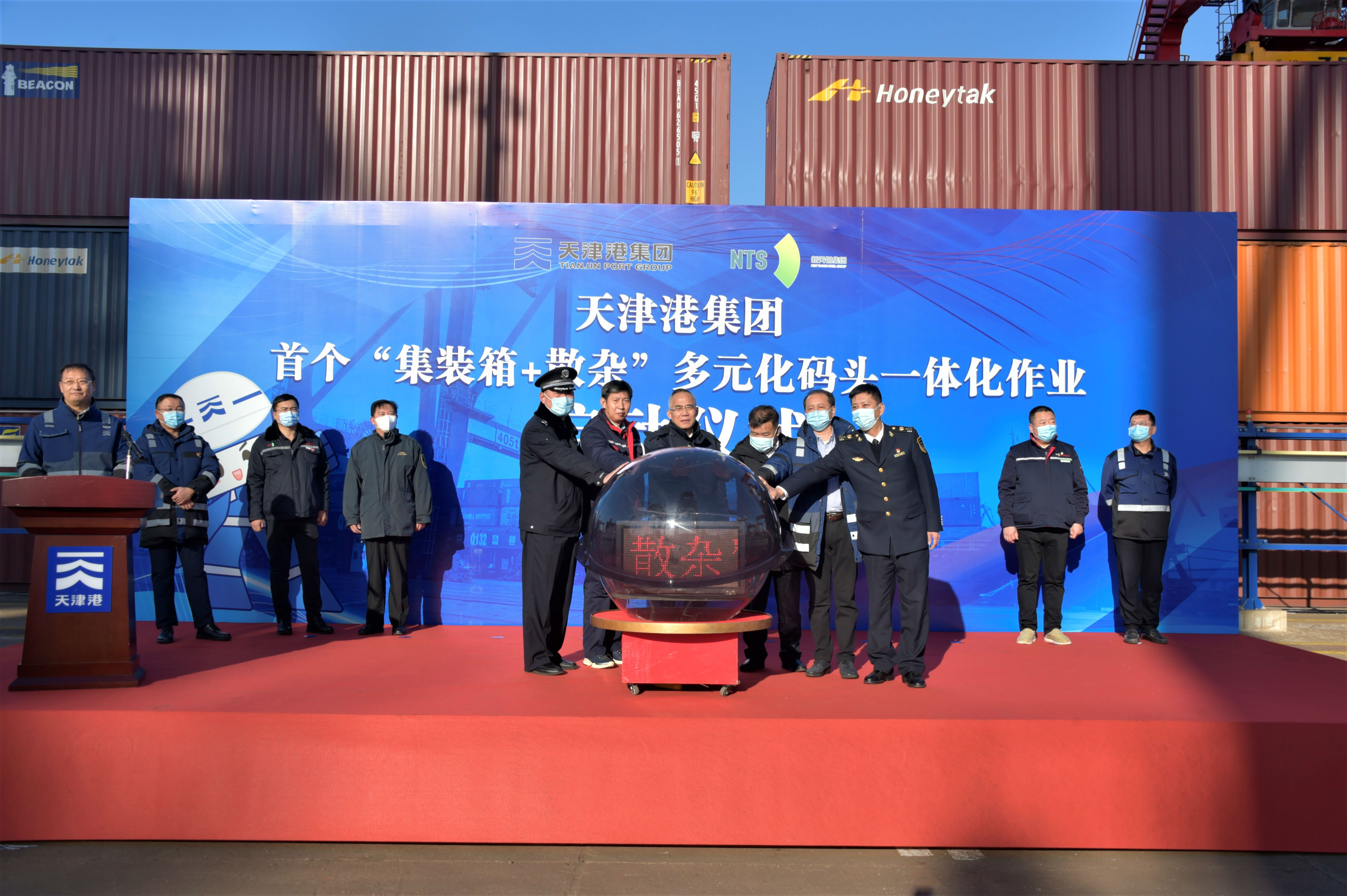 天津海关党委委员、天津新港海关关长师国旺、天津市港航管理局局长王洪海、新天钢集团执行总裁阚永海、天津港集团副总裁许旭波、天津出入境边防检查站站长张军、北疆海事局副局长王辉共同启动天津港“集装箱+散杂”多元化码头一体化作业。