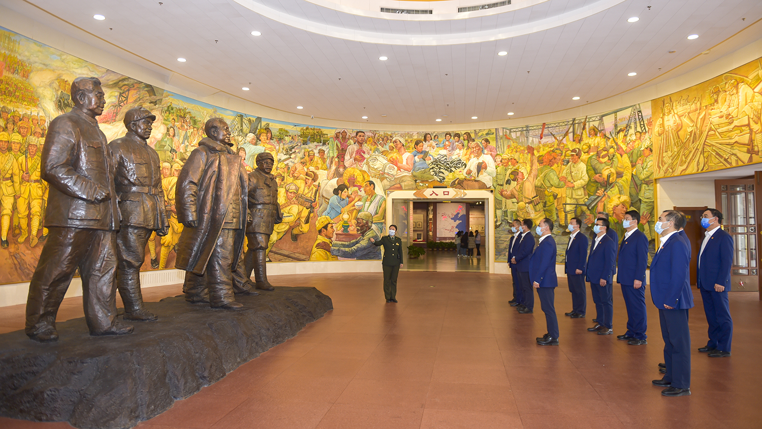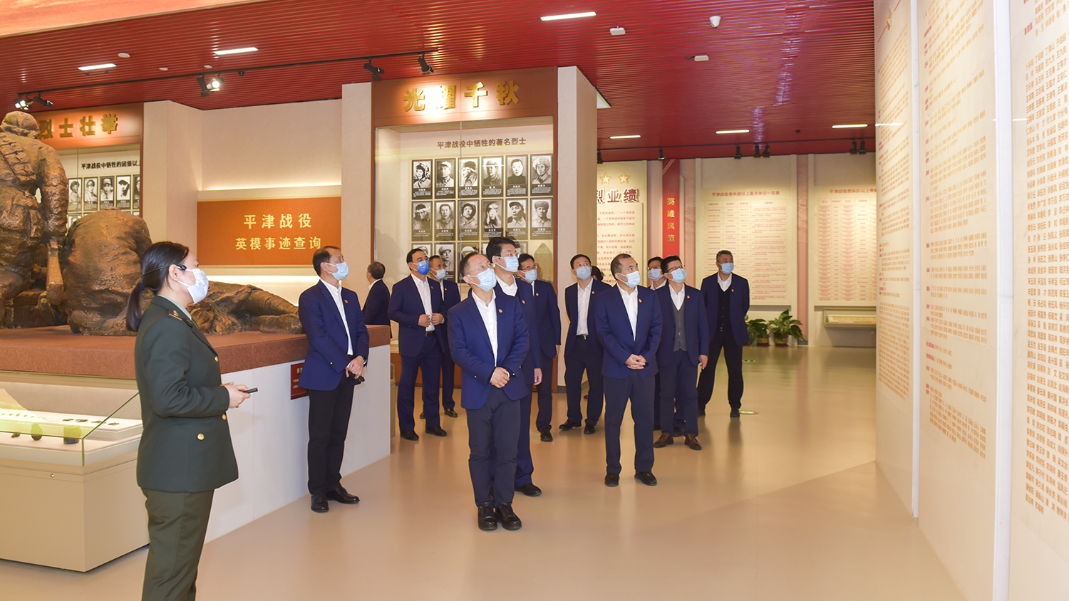 缓步走进庄严肃穆、古朴雄浑的平津战役纪念馆,集团公司领导集体驻足《走向胜利》铸铜雕像前,瞻仰毛泽东等五位伟人的领袖风采,深切缅怀老一辈无产阶级革命家的丰功伟绩,怀想中国人民解放军英勇奋战、夺取平津战役胜利的宏大史诗。