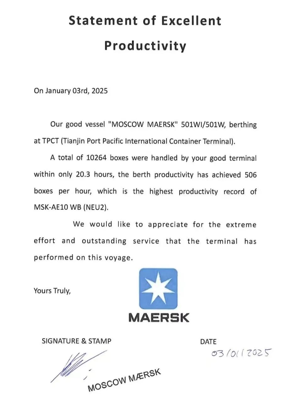 新年新气象!1月3日晚,随着2M北欧Ⅱ线“莫斯科马士基”轮最后一根缆绳解离,太平洋国际公司以每小时506自然箱的在泊船时效率,一举刷新该航线的全球最高纪录,同时创造了天津港集装箱船舶作业在泊船时效率新纪录。