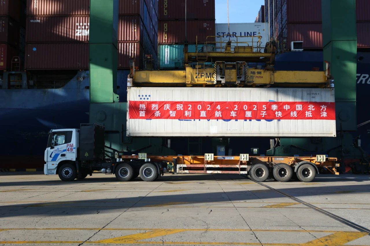 今年以来,天津港集团相继开通至南美西、南美东、中美洲3条直航拉美航线,直达智利、厄瓜多尔、阿根廷、秘鲁等“一带一路”沿线国家,覆盖拉美地区太平洋和大西洋的主要港口,将出口货物运输时间缩短至35天。其中南美西至天津港直航航线运营超过40航次,船舶艘次与载箱量显著增长,南美地区的蓝莓、香蕉、车厘子、白虾及冷冻肉类得以“快船”直达天津。
