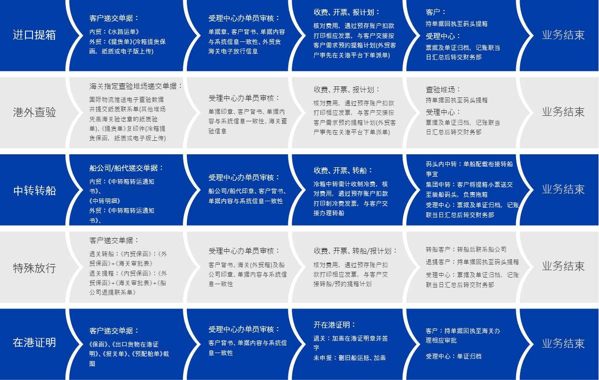 业务类型:进口提箱、港外查验、中转转船、特殊放行、在港证明
